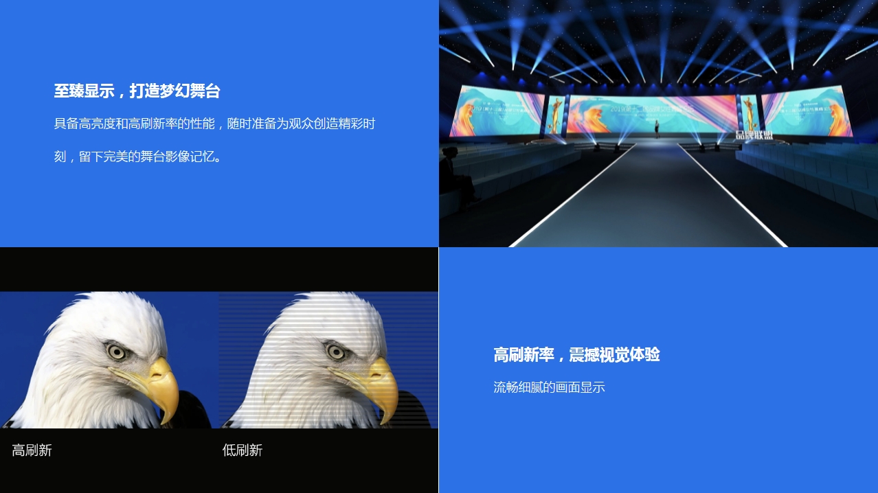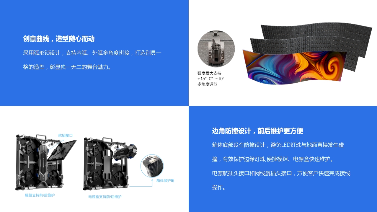 專為打造大舞臺而誕生,提供多種點間距產(chǎn)品滿足客戶搭建戶內/戶外大屏的需要。500*500mm短箱體靈活度高,方便打造各式舞臺造型;500*1000mm長箱體采用大尺寸設計,能夠幫助客戶在短時間內迅速完成屏幕搭建。采用輕量化設計理念,單人即可完成箱體拆裝操作。